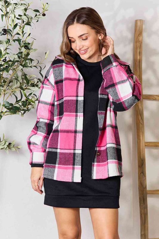 Double Take Plaid Collared Dropped Shoulder Jacket